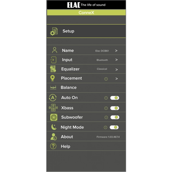 Le contrôle du système s’effectue via une télécommande infrarouge fournie ou par l’application mobile Elac Debut ConneX, disponible sur iOS et Android. L’application permet d’accéder à plusieurs réglages :
